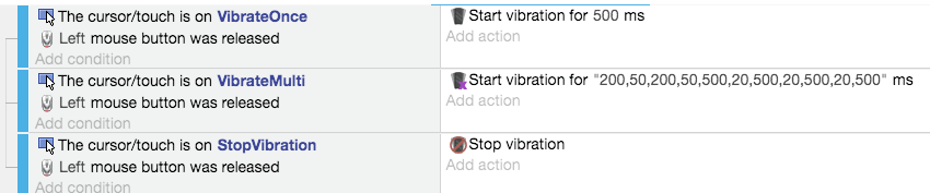 All actions, conditions and expressions are listed in the device vibration reference page.