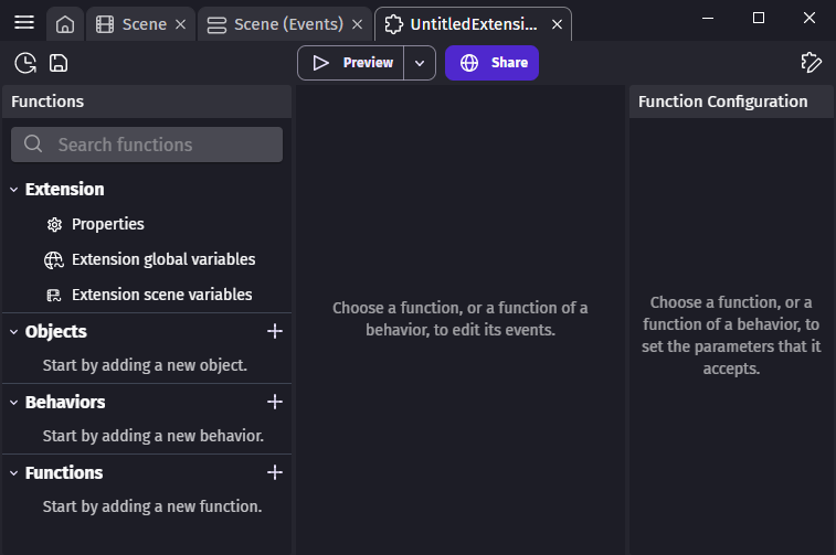 Similarly to scenes, custom behaviors are created with events. Every behavior from community extensions is a custom behavior and contains events that can be edited by anyone.