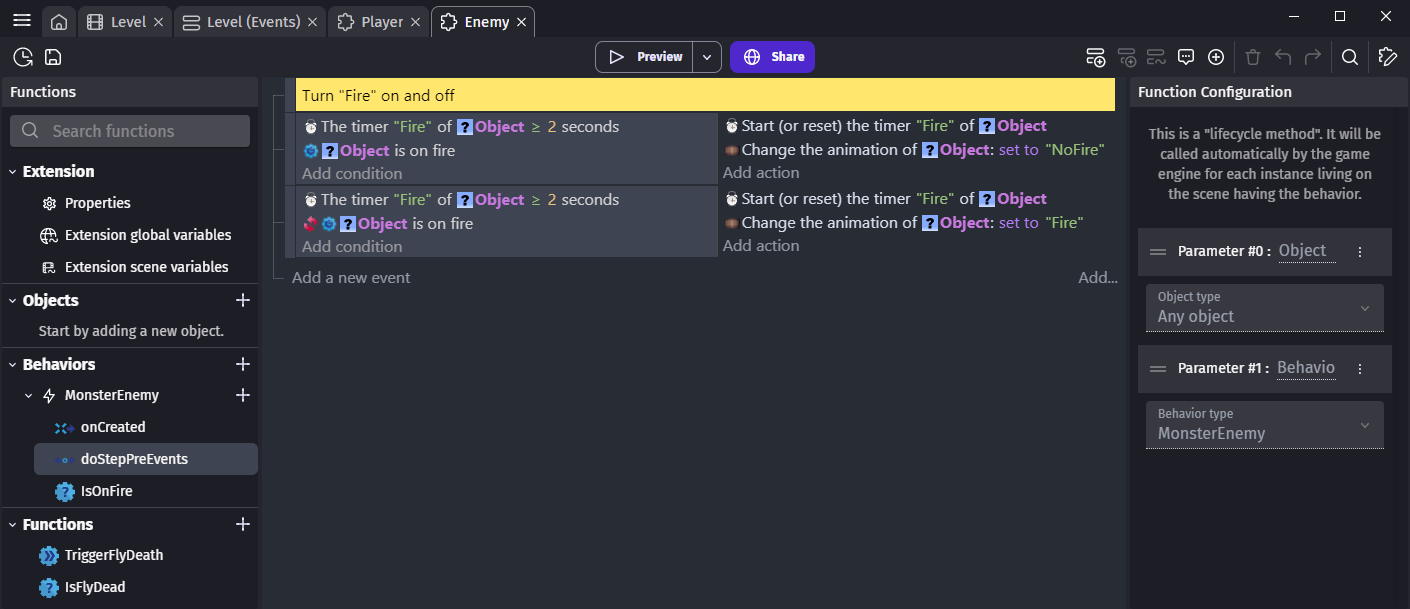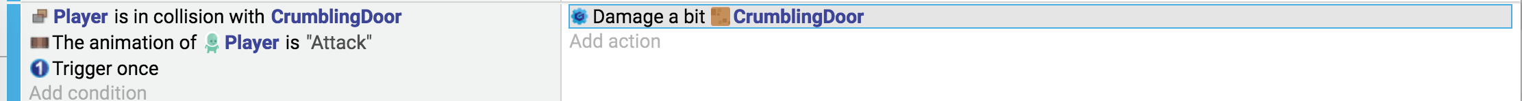 • There can be an action "Hit the object", a condition "Is the object dead?". The behavior will take care of updating the object variables to track the life of the enemy (for example, when the enemy is hit, you remove some life.