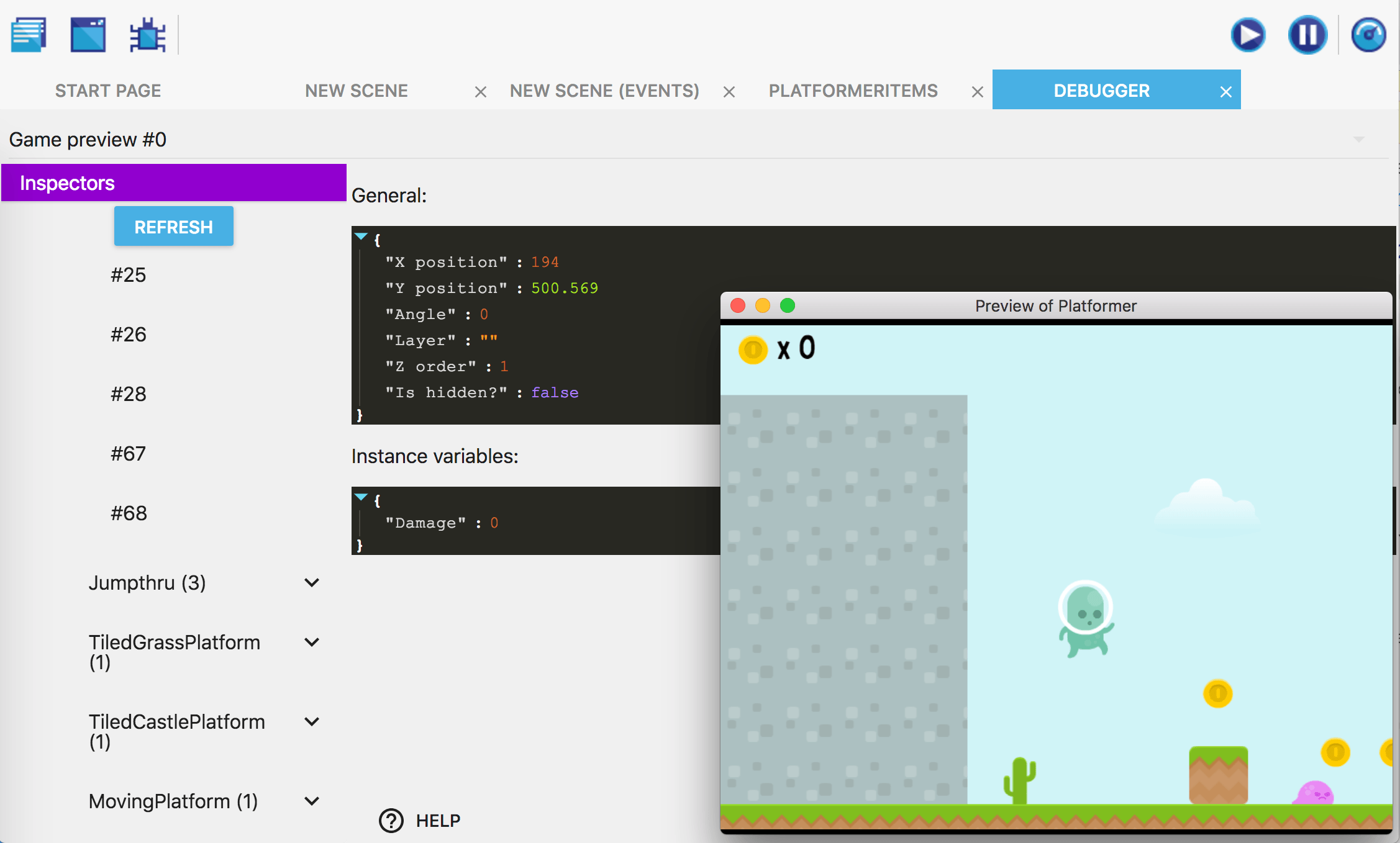 To test this, we've added the "Destructible" behavior to object "Platform". Then, when using the debugger, we can inspect "Platform" instances and see that they have a "Damage" variable (set to 0). If we use the debugger (or an event) to set it to 100, the object is removed from the scene: