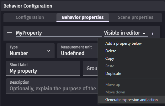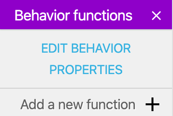 Behaviors can also embed properties, which are number, strings or booleans that are stored inside the behavior. Check out the section below about how to add and use properties.