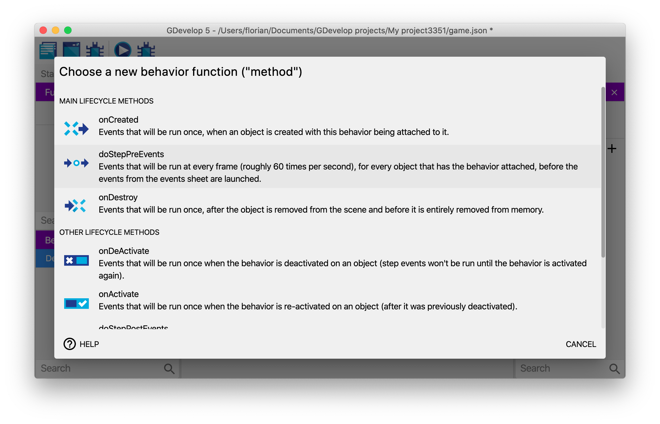 • doStepPostEvents: events that will be run for every single object having the behavior, after the "traditional" events of the scene, if the behavior is not deactivated. Typically, this is done 60 times per second. It's recommended to prefer doStepPreEvents, to run your logic before events and give the events in the scene a chance to react to changes that happen on the objects.