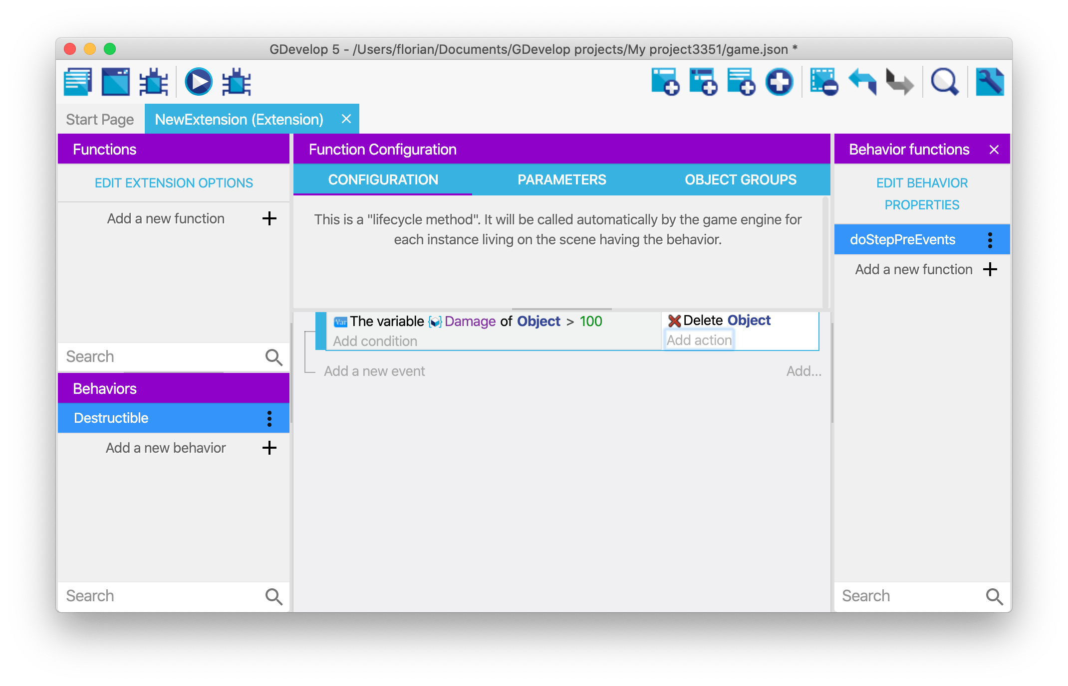 You can run the game and see that the events in the doStepPreEvents function (or doStepPostEvents) will be executed. In the example of the Destructible behavior that was created, if the "Damage" variable is set to a number greater or equal to 100, the object will be destroyed automatically.