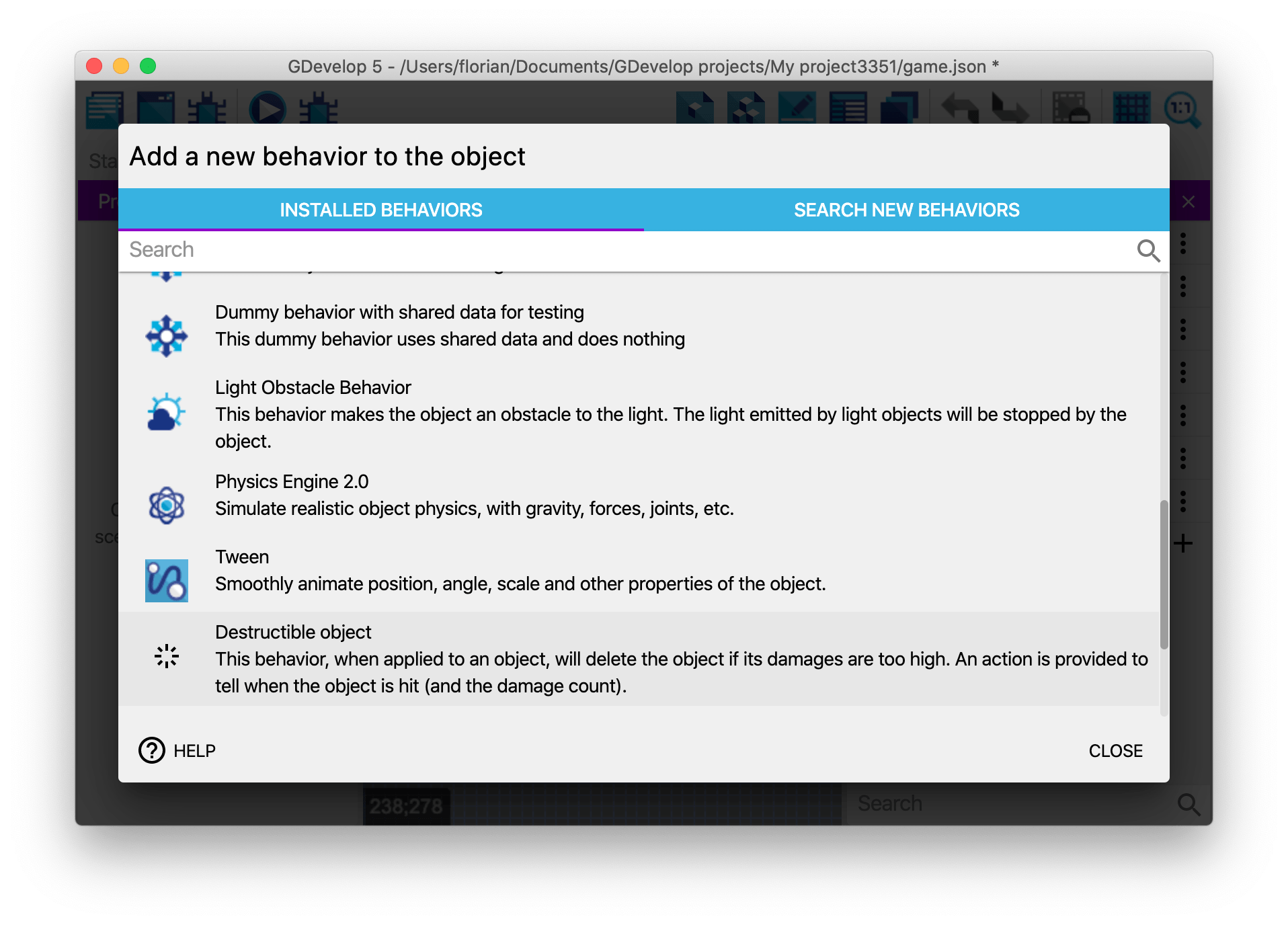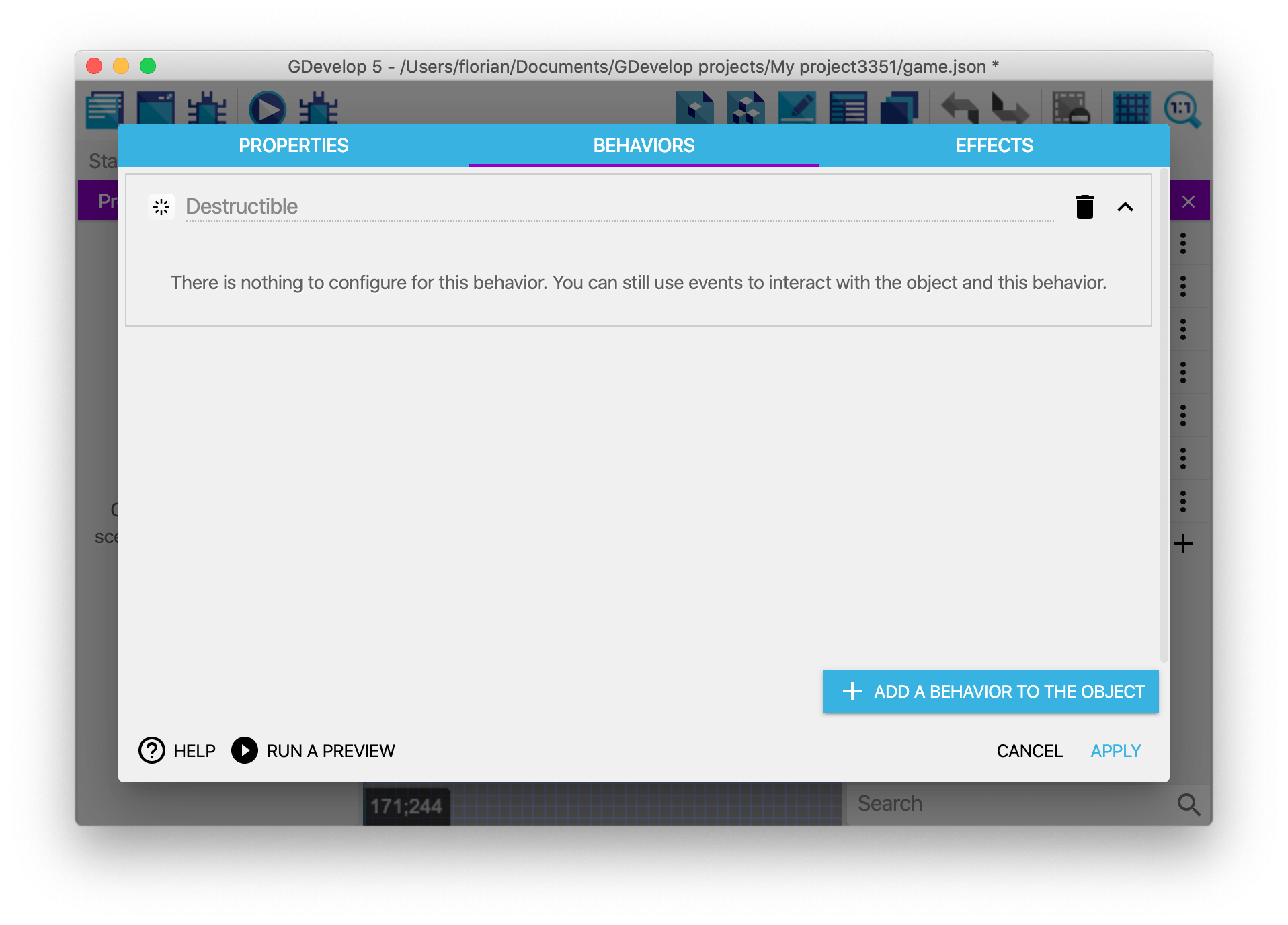 Here, you can see the "Destructible Object" behavior for example (that was created in the previous screenshots):