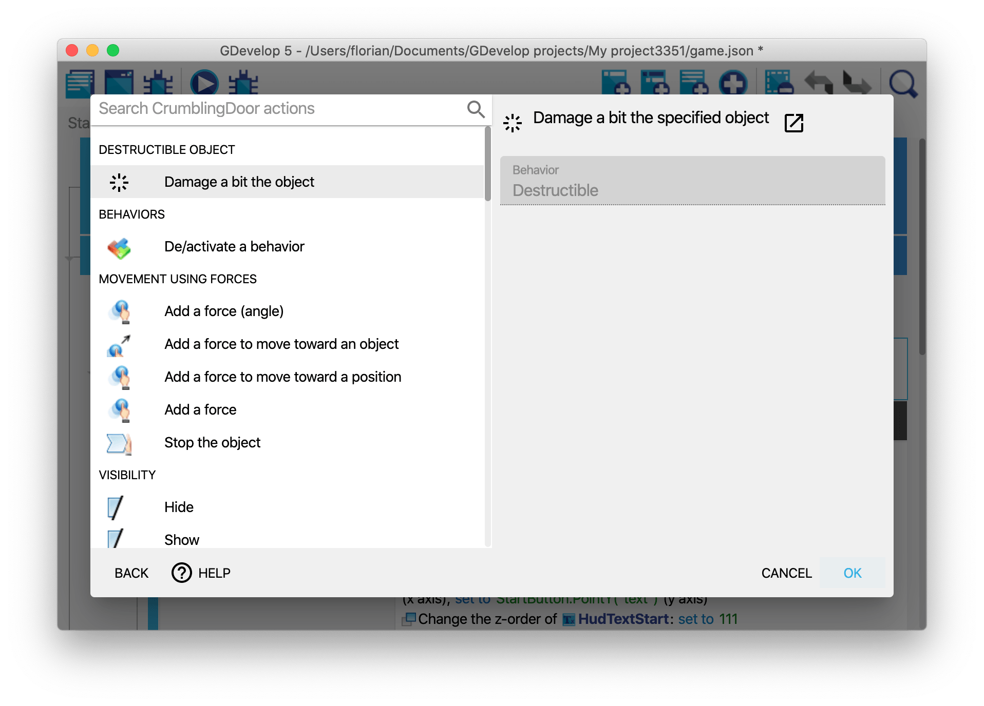 Like any other "built-in behavior", you can also use actions/conditions (or expressions) if you have declared functions as such in the behavior. For example, in the "Destructible" behavior, we created an action to cause some damage to the object. We can find it and use it in the events sheet:
