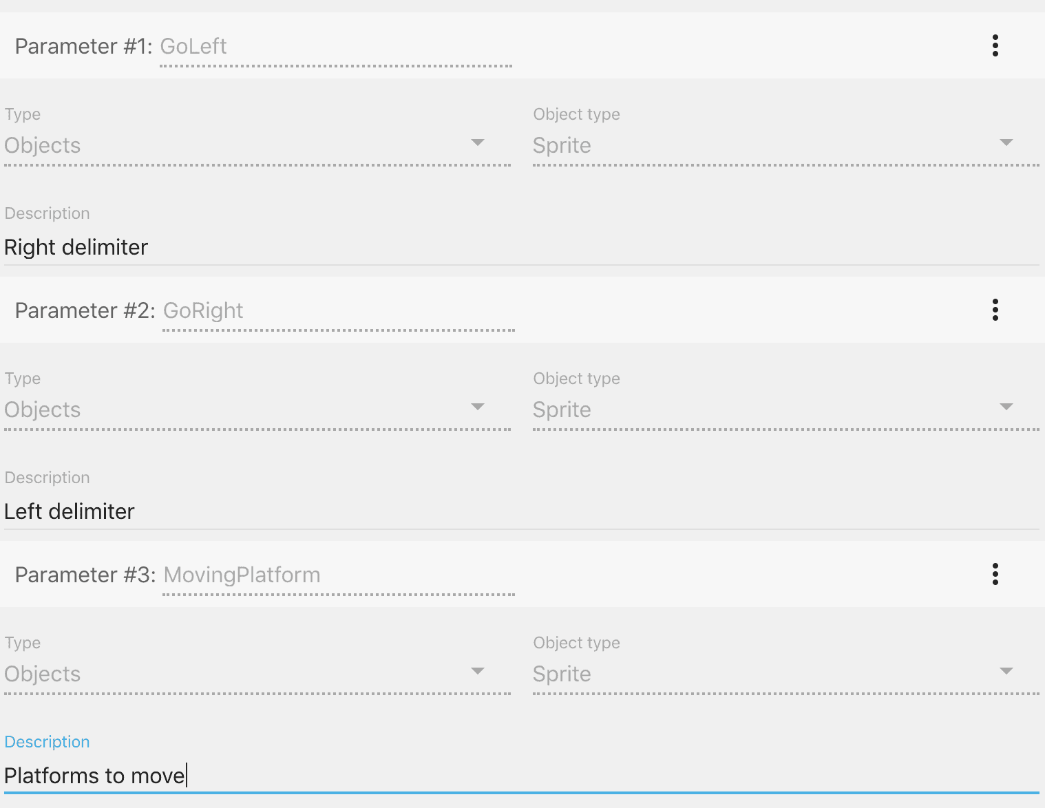 Parameters are automatically extracted from the events by GDevelop. GDevelop will understand which objects, groups and behaviors you're using - as well as the object types.
