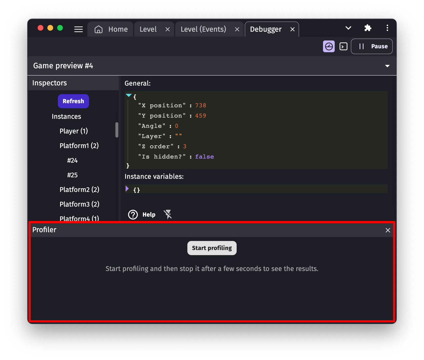 The Profiler is a tool that measures the time spent on different aspects of your game while it is running. It helps to find bottlenecks between your events and the rendering of the game that could be taking up a lot of resources.