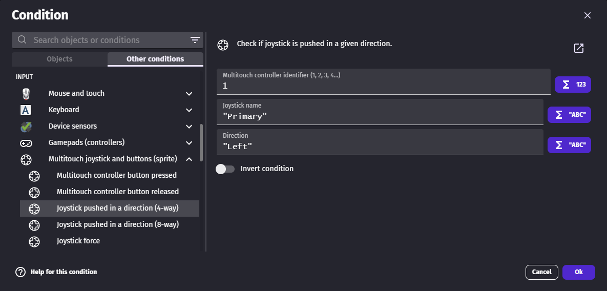 Joysticks and buttons can be used to create controls similar to a real gamepad. Interactions of each player can be checked with the conditions in the following screenshot.