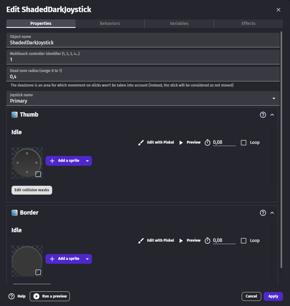 A joystick object can also be created from scratch. It needs an image for the border and another one for the part that follows the player's finger.