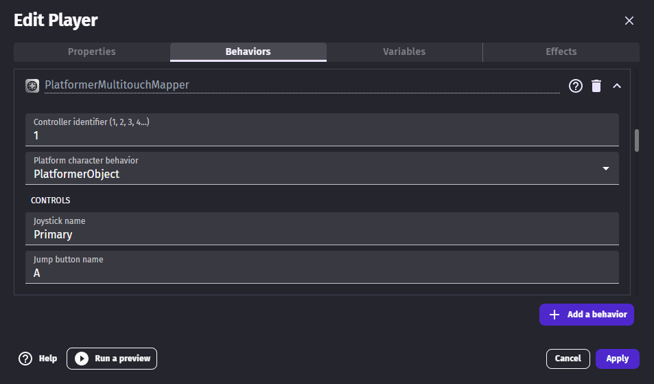 The "3D platformer multitouch controller mapper" behavior can be added to a 3d physics character to make the character move according to player touches automatically.