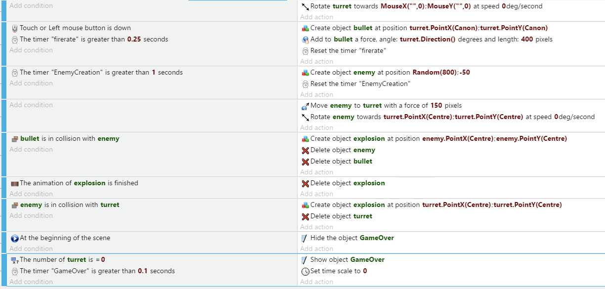 The only thing is left to do is to tell GDevelop to fire the bullets from the "Canon" point of the "turret" object. So in our "create bullet" action, we need to change turret.X() and turret.Y() expressions, to turret.PointX("Canon") and turret.PointY("Canon"). We can change them by clicking the expressions inside the editor.