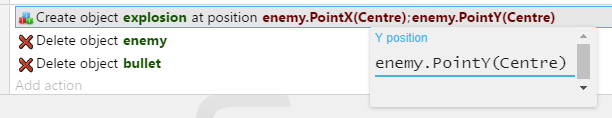 Finally, instead of creating the "explosion" object at the "Origin" point of the "enemy", it is necessary to create the object at the Centre Point. Change the expression in the create explosion action from enemy.X() to enemy.PointX("Centre") and from enemy.Y() to enemy.PointY("Centre")
